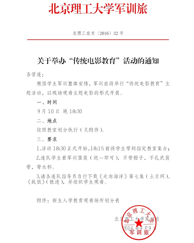 北理工旅发〔2016〕32号:关于举办“传统电影教育”活动的通知