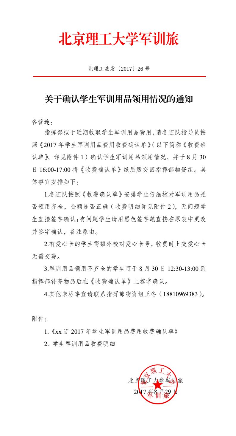 北理工旅发〔2017〕26号:关于确认学生军训用品领用情况的通知