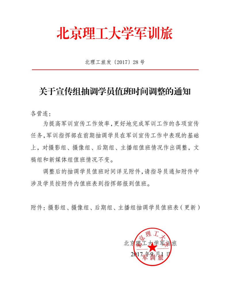 北理工旅发〔2017〕28号:关于宣传组抽调学员值班时间调整的通知